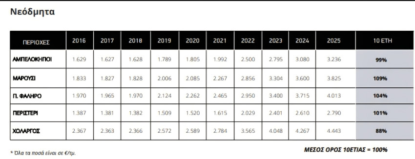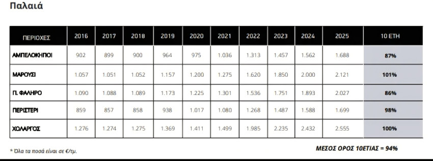 Αποκαλυπτικά είναι τα στοιχεία αν ανατρέξει, μάλιστα, κανείς σε βάθος δεκαετίας, καθώς φαίνεται πως υπάρχει αύξηση κατά μέσο όρο 100% στα νεόδμητα και 94% στα παλαιότερα διαμερίσματα σε σχέση με τις αξίες του 2016!!! Ενδεικτικά, ένα παλιό διαμέρισμα στο Μαρούσι, με τιμή 1.057 ευρώ/τ.μ. το 2016, έφτασε στα 2.121 ευρώ/τ.μ. το 2025. Όσο για τα νεόδμητα, μια τυπική κατοικία στο Π. Φάληρο, εκτινάχθηκε από τα 1.970 ευρώ/τ.μ. στα 4.013 ευρώ/τ.μ.!