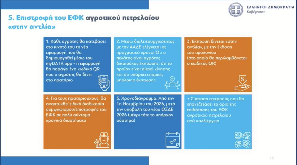 - Για τους πρατηριούχους, θα αναπτυχθεί ειδική διαδικασία συμψηφισμού/επιστροφής του ΕΦΚ σε πολύ σύντομα χρονικά διαστήματα.