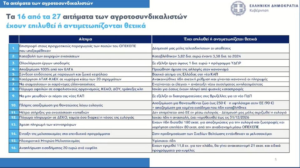 16 από τα 27 αιτήματα των αγροτών έχουν ικανοποιηθεί – 4 είναι υπό επεξεργασία