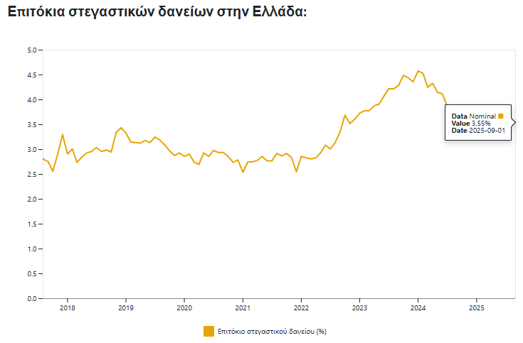 Όπως σημειώνει η Global Property Guide, καθώς η ελληνική αγορά στεγαστικών δανείων εξακολουθεί να καθορίζεται από δάνεια κυμαινόμενου επιτοκίου, η χαλάρωση της πολιτικής της ΕΚΤ κατά το δεύτερο εξάμηνο του 2024 και στις αρχές του 2025 τελικά μεταφράστηκε σε χαμηλότερα επίπεδα επιτοκίων τόσο για τα νέα όσο και για τα υφιστάμενα στεγαστικά δάνεια στη χώρα, τα οποία φαίνεται να έχουν σταθεροποιηθεί τους τελευταίους μήνες, και το χάσμα μεταξύ των μέσων επιτοκίων στις δύο κατηγορίες δανείων έχει πρακτικά εξαλειφθεί. Από τον Οκτώβριο του 2025, η ΤτΕ ανέφερε το σταθμισμένο μέσο επιτόκιο των νέων στεγαστικών δανείων προς ιδιώτες και ιδιωτικά μη κερδοσκοπικά ιδρύματα στο 3,51%, από 3,77% πριν από ένα χρόνο. Αποτέλεσμα; Στο δεκάμηνο του 2025 οι τράπεζες έδωσαν συνολικά 1,63 δισεκατομμύρια ευρώ σε νέα στεγαστικά δάνεια, ποσό που ήταν 45,8% υψηλότερο από ό,τι κατά την ίδια περίοδο του 2024.