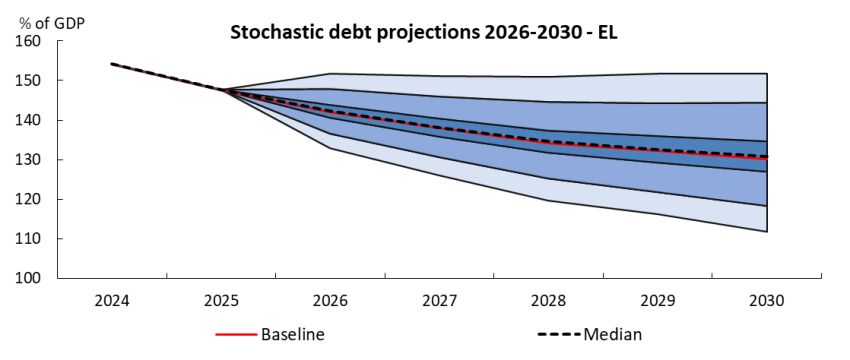 Σύμφωνα με το Debt Monitor της Ευρωπαϊκής Επιτροπής, η πιθανότητα αύξησης του χρέους και ο βαθμός αβεβαιότητας ποικίλλουν σημαντικά μεταξύ των χωρών. Μεταξύ των χωρών με τα υψηλότερα επίπεδα χρέους το 2025, η ανάλυση υποδεικνύει υψηλό κίνδυνο ακόμη μεγαλύτερου χρέους σε 5 χρόνια σε ορισμένες χώρες (ιδίως στο Βέλγιο, τη Γαλλία και τη Φινλανδία και, σε μικρότερο βαθμό, στην Ισπανία, την Ιταλία και την Αυστρία) και σημαντική αβεβαιότητα όσον αφορά στις βασικές προβλέψεις στην Ελλάδα, όπου το μέγεθος της διαφοράς είναι 40 μονάδες βάσης.