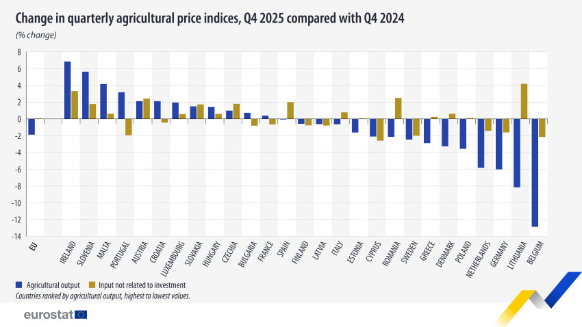 Σύμφωνα με τα τελευταία στοιχεία της Eurostat, η μέση τιμή της γεωργικής παραγωγής μειώθηκε σε 15 χώρες της ΕΕ, με τους πιο απότομους ρυθμούς μείωσης στο Βέλγιο (-12,9% σε σύγκριση με το τέταρτο τρίμηνο του 2024), τη Λιθουανία (-8,2%) και τη Γερμανία (-6%). Σε επίπεδο ΕΕ, οι τιμές του γάλακτος και των δημητριακών μειώθηκαν κατά 4,1% και κατά 8,9% αντίστοιχα το τελευταίο τρίμηνο του 2025 σε σύγκριση με το ίδιο τρίμηνο του 2024.