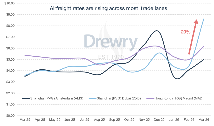 Σύμφωνα με την Drewry Airfreight Insight, οι διεθνείς τιμές γενικών αερομεταφορών έχουν αυξηθεί έως και 95% μεταξύ Φεβρουαρίου και Μαρτίου, καθώς η μειωμένη χωρητικότητα αερομεταφορών και οι υψηλότερες τιμές καυσίμων που προκλήθηκαν από τον πόλεμο στο Ιράν απείλησαν να επαναφέρουν τις τιμές σε επίπεδα ρεκόρ της Covid.
