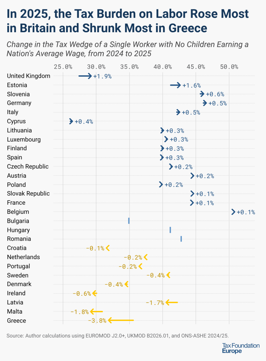 Συνολικά, μεταξύ 2024 και 2025, 16 ευρωπαϊκές χώρες αύξησαν τη φορολογική τους επιβάρυνση στην εργασία, ενώ 9 χώρες τη μείωσαν. Αρκετές χώρες στην Ευρώπη δεν προσαρμόζουν τον φόρο εισοδήματος ούτε στο πληθωρισμό ούτε στους συνολικούς μισθούς, οι οποίοι μπορούν να οδηγήσουν σε υψηλότερα κλιμάκια, ωθώντας έτσι ακούσια τους εργαζόμενους σε υψηλότερες φορολογικές κλίμακες.