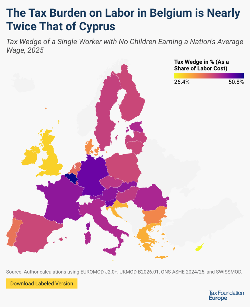 Το Βέλγιο έχει την υψηλότερη φορολογική επιβάρυνση στην εργασία με 50,8% (επίσης την υψηλότερη από όλες τις χώρες του ΟΟΣΑ), ακολουθούμενη από τη Γερμανία και τη Σλοβενία με 46,6% και 46,2% αντίστοιχα. Η Κύπρος είχε τη χαμηλότερη φορολογική επιβάρυνση στο 26,4%, ακολουθούμενη από τη Μάλτα και το Ηνωμένο Βασίλειο (και οι δύο με 29,2%).