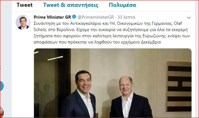 "Συνάντηση με τον Αντικαγκελάριο και Υπ. Οικονομικών της Γερμανίας, Olaf Scholz, στο Βερολίνο. Είχαμε την ευκαιρία να συζητήσουμε για όλα τα εκκρεμή ζητήματα που αφορούν στην καλύτερη λειτουργία της Ευρωζώνης, ενόψει των αποφάσεων που πρόκειται να ληφθούν τον ερχόμενο Δεκέμβριο", έγραψε ο κ. Τσίπρας στο twitter.