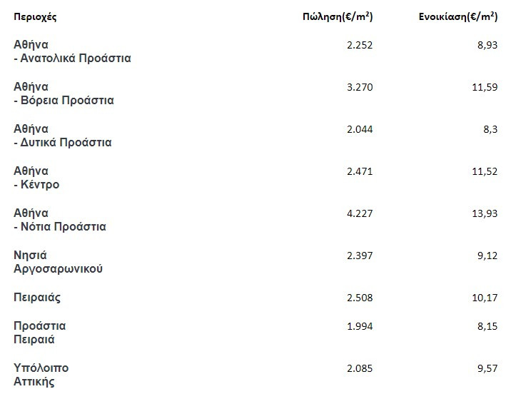 Τον ίδιο μήνα, η ζητούμενη τιμή για ακίνητα προς ενοικίαση ήταν υψηλότερη Νότια Προάστια, με € 13,93 το μήνα ανά τ.μ. Η χαμηλότερη τιμή αντίστοιχα, ήταν στον Πειραιά, με μέσο όρο € 8,15 το μήνα ανά τ.μ..