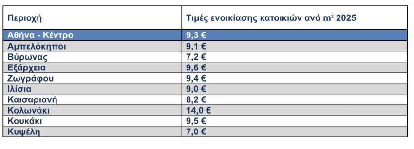 Οι χαμηλότερες μέσες τιμές ενοικίων εντοπίζονται, σύμφωνα με στοιχεία της RE/MAX Ελλάς, στην Κυψέλη (7 ευρώ ανά τ.μ.), στα Πατήσια και στο Βύρωνα (7,2 ευρώ ανά τ.μ.) και στην Καισαριανή (8,2 ευρώ ανά τ.μ.). Κατά μέσο όρο πάνω από 9 ευρώ ανά τ.μ. ενοικιάζονται κατοικίες σε Αμπελόκηπους (9,1 ευρώ ανά τ.μ.), Ζωγράφου (9,4 ευρώ ανά τ.μ.), Κουκάκι (9,5 ευρώ ανά τ.μ.), Εξάρχεια (9,6 ευρώ ανά τ.μ.), Νέο Κόσμο (9,8 ευρώ ανά τ.μ.), περιοχή Χίλτον (10 ευρώ ανά τ.μ.) και Λυκαβηττό (12 ευρώ ανά τ.μ.).