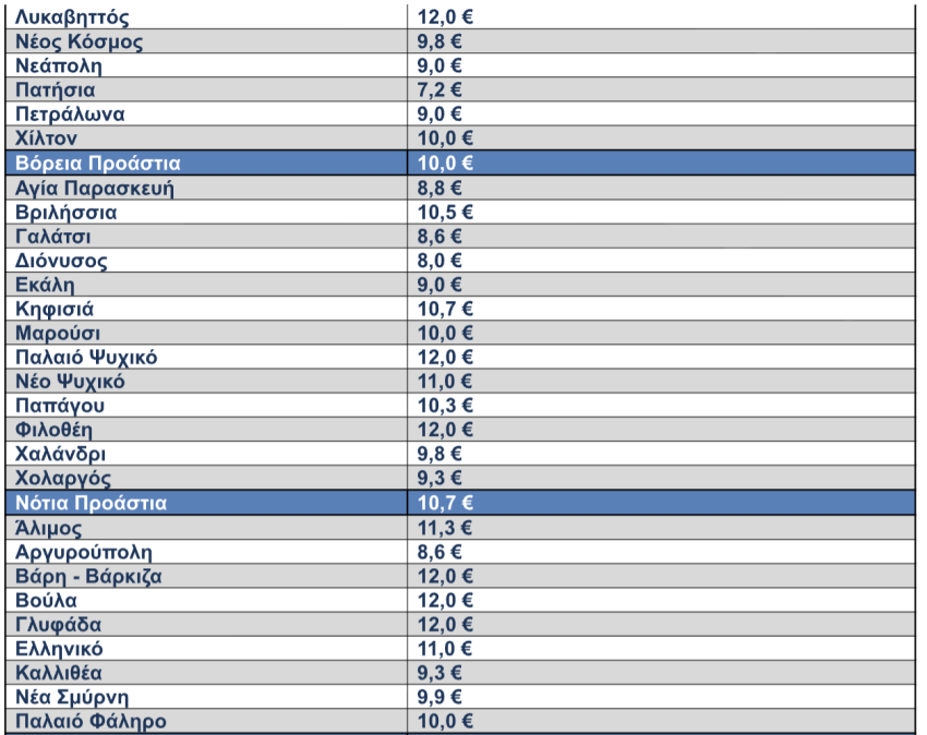 Αναλυτικότερα, στον Δήμο της Αθήνας, το μέσο ενοίκιο ανέρχεται σε 9,3 ευρώ ανά τετραγωνικό μέτρο. Μάλιστα, στον συγκεκριμένο Δήμο η υψηλότερη μέση τιμή εντοπίζεται στο Κολωνάκι (κατά μέσο όρο 14 ευρώ ανά τ.μ.) όπου είναι και η μεγαλύτερη σε όλο το νομό Αττικής.