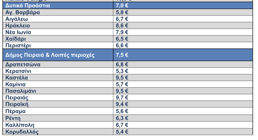 Στα Δυτικά Προάστια, οι τιμές κινούνται σε αρκετά χαμηλότερα επίπεδα με τη μέση τιμή να διαμορφώνεται στα 7 ευρώ ανά τετραγωνικό μέτρο. Ειδικότερα, στην Αγία Βαρβάρα καταγράφεται η χαμηλότερη μέση τιμή (5,8 ευρώ ανά τ.μ.) και ακολουθούν: Χαϊδάρι (6,5 ευρώ ανά τ.μ.), Περιστέρι (6,6 ευρώ ανά τ.μ.), Αιγάλεω (6,7 ευρώ ανά τ.μ.), Νέα Ιωνία (7,9 ευρώ ανά τ.μ.), Νέο Ηράκλειο (8,6 ευρώ ανά τ.μ.).