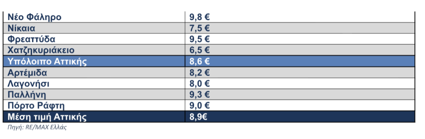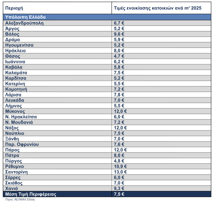 Από την άλλη, οι υψηλότερες μέσες τιμές ενοικίων καταγράφονται, σύμφωνα με τη RE/MAX Ελλάς, στη Σαντορίνη (13 ευρώ ανά τ.μ.), στη Μύκονο, στην Πάρο και στη Νάξο (12 ευρώ ανά τ.μ.) και στο Ρέθυμνο (10,9 ευρώ ανά τ.μ.).