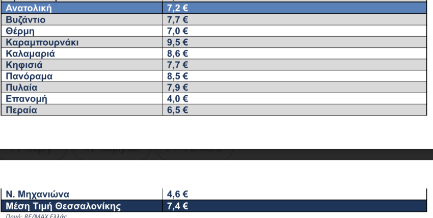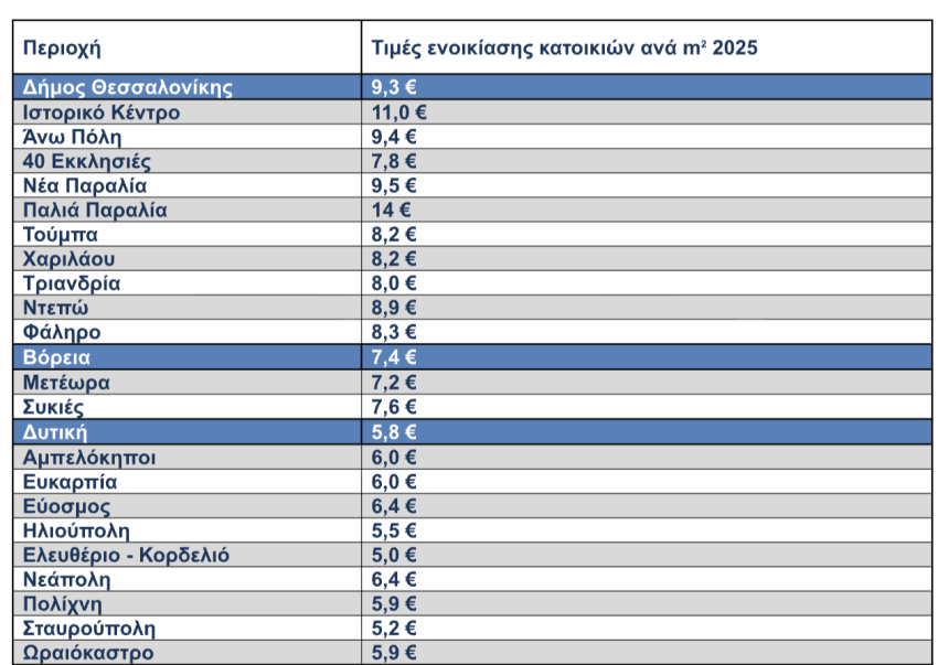 Ειδικότερα, στο Δήμο Θεσσαλονίκης και συγκεκριμένα στην περιοχή 40 Εκκλησιές καταγράφεται η χαμηλότερη μέση τιμή ενοικίασης κατοικιών (7,8 ευρώ ανά τ.μ.) και ακολουθούν στην Τριανδρία (8 ευρώ ανά τ.μ.) στην Τούμπα και στου Χαριλάου (8,2 ευρώ ανά τ.μ.), στο Φάληρο (8,3 ευρώ ανά τ.μ.). Οι υψηλότερες μέσες τιμές εκτός από την Παλιά Παραλία καταγράφονται στην Άνω Πόλη (9,4 ευρώ ανά τ.μ.), στη Νέα Παραλία (9,5 ευρώ ανά τ.μ.) και στο Ιστορικό Κέντρο (11 ευρώ ανά τ.μ.).