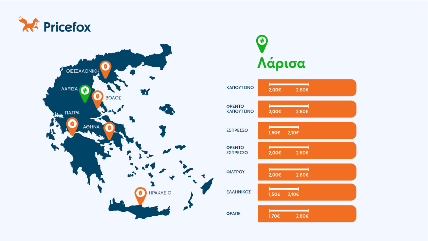 Ο φθηνότερος καφές στη Λάρισα είναι ο εσπρέσο και ο ελληνικός και ο εσπρέσο στα €1,83, ενώ ο ακριβότερος είναι ο φρέντο καπουτσίνο που φτάνει μέχρι και €2,80.