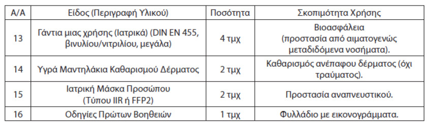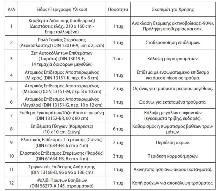 Το φαρμακείο θα πρέπει πλέον να περιέχει κατ' ελάχιστον 16 αντικείμενα. Μεταξύ αυτών, ξεχωρίζουν για πρώτη φορά είδη όπως η ισοθερμική κουβέρτα, ενώ δίνεται έμφαση στην ποιότητα και τις διαστάσεις των υλικών.