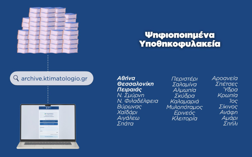 Στο μεταξύ, ο κ. Κυρανάκης υπογράμμισε ότι τα υποθηκοφυλακεία ψηφιοποιούνται. «Το έργο ψηφιοποίησης των αρχείων προχωρά, οι δικηγόροι οι οποίοι κάνουν έρευνα τίτλων για λογαριασμών των πελατών τους όταν θέλουν να αγοράσουν ένα ακίνητο σε Αθήνα, Θεσσαλονίκη, Πειραιά και σε 30 ακόμη υποθηκοφυλακεία δεν χρειάζεται να ξαναπάνε να κάνουν έρευνα βαρών, μπορούν να το κάνουν από τον υπολογιστή τους από την διεύθυνση archive.ktimatologio.gr. Αυτή την στιγμή έχουν ψηφιοποιηθεί πάνω από 50 εκατ. σελίδες χαρτιού και το πιο σημαντικό από όλα είναι ότι εδώ και κάποιους μήνες το 90% της κίνησης, των πράξεων που υποβάλλονται σε Αθήνα, Θεσσαλονίκη γίνεται ψηφιακά».